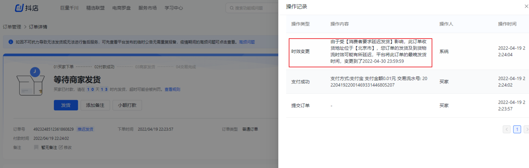 订单命中平台疫情规则的区域,发货时效变更记录,详细的平台公告规则可去报备中心查看