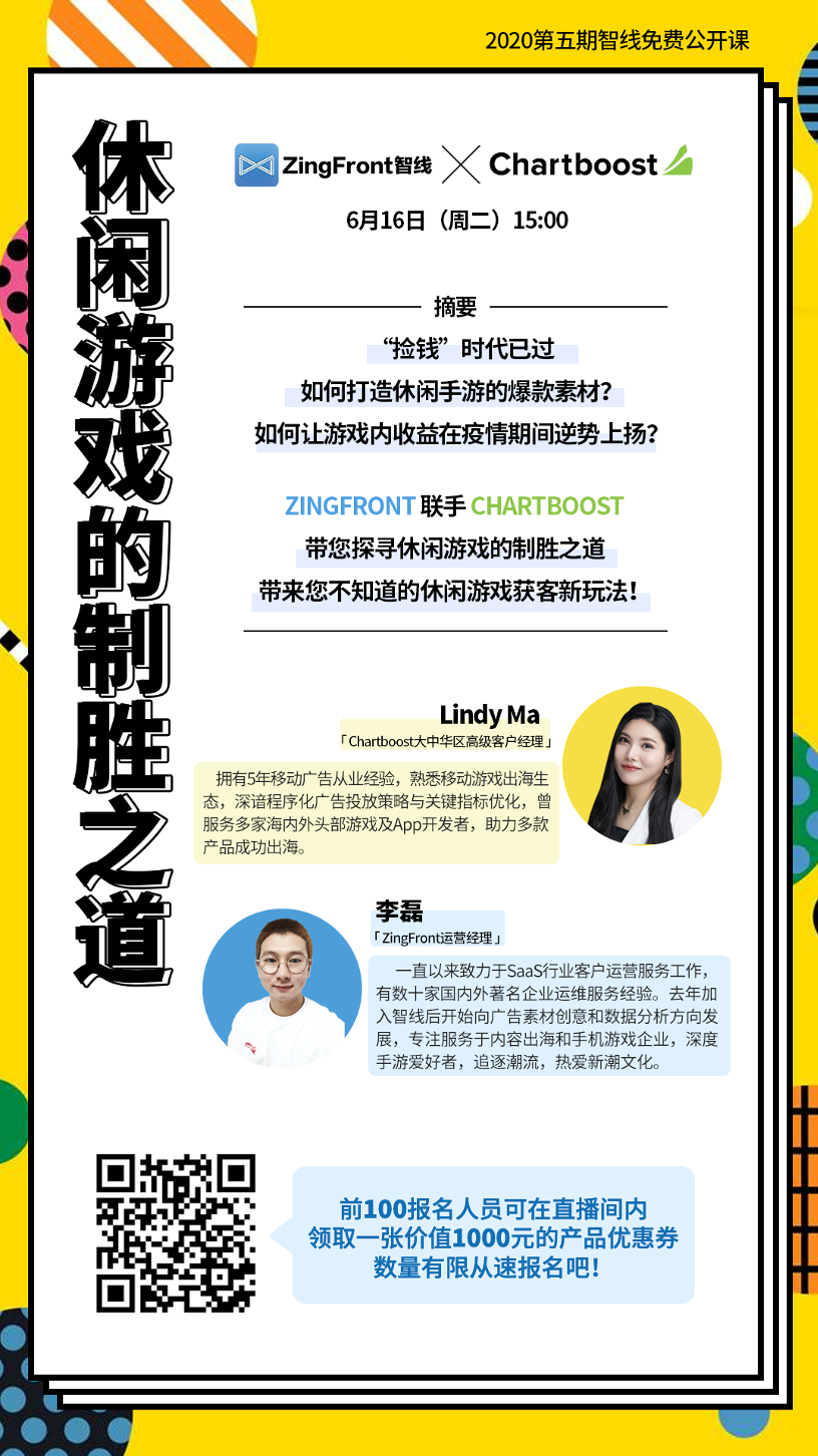 6月16日(周二)15:00, ZingFront(智线)将联手超过30万的全球移动游戏及应用,月独立用户超9亿的Chartboost平台为您一一破解这些问题的真相。同时前100名报名还可领取价值1000元的产品优惠券,名额有限,赶快扫下方海报二维码报名吧!