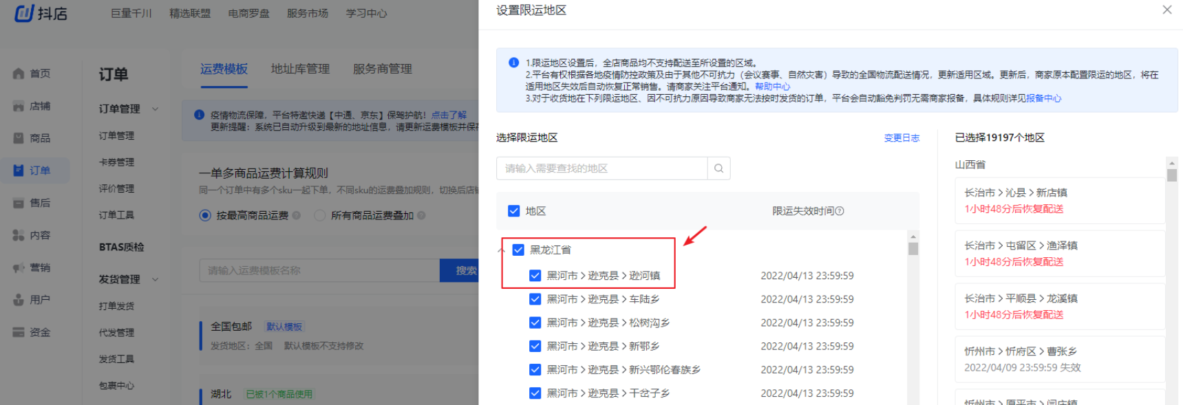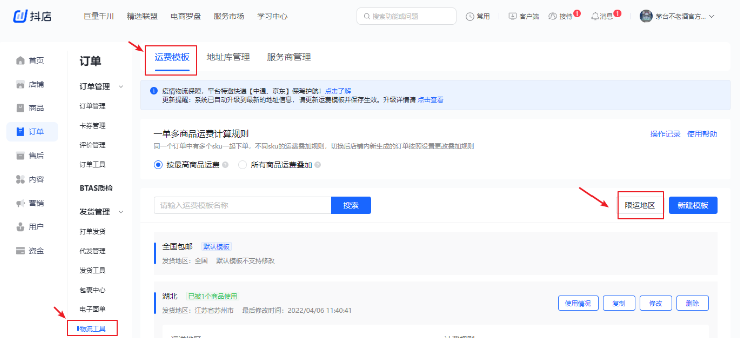 1、商家可以在抖店后台-订单-订单管理-物流工具-运费模板中点击屏幕右侧的【限运地区】按键,进入二级界面,即可来做具体的地址选择。