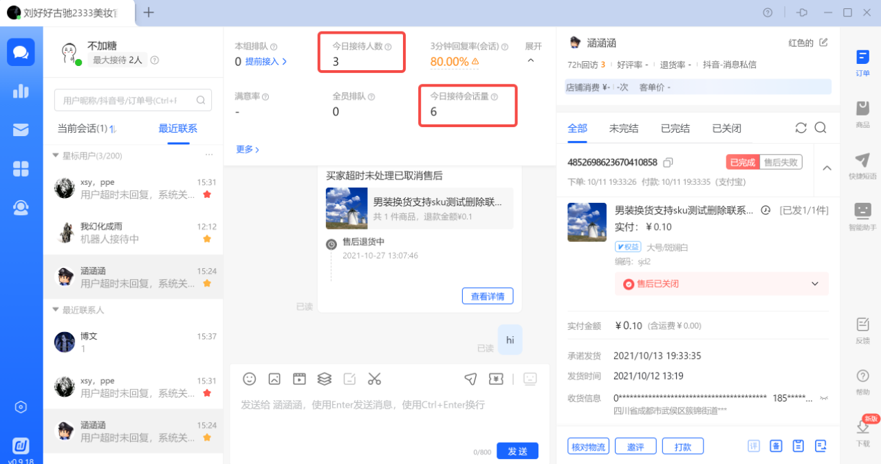 会话量容易受关闭会话影响,最极端的情况是客服每回复一句话就关闭会话,一天下来,客服的接待会话量会非常大,但实际上接待的人数可能很少。主管在考核客服时,可以参考接待人数和接待量两个指标,来确定客服的实际工作量。