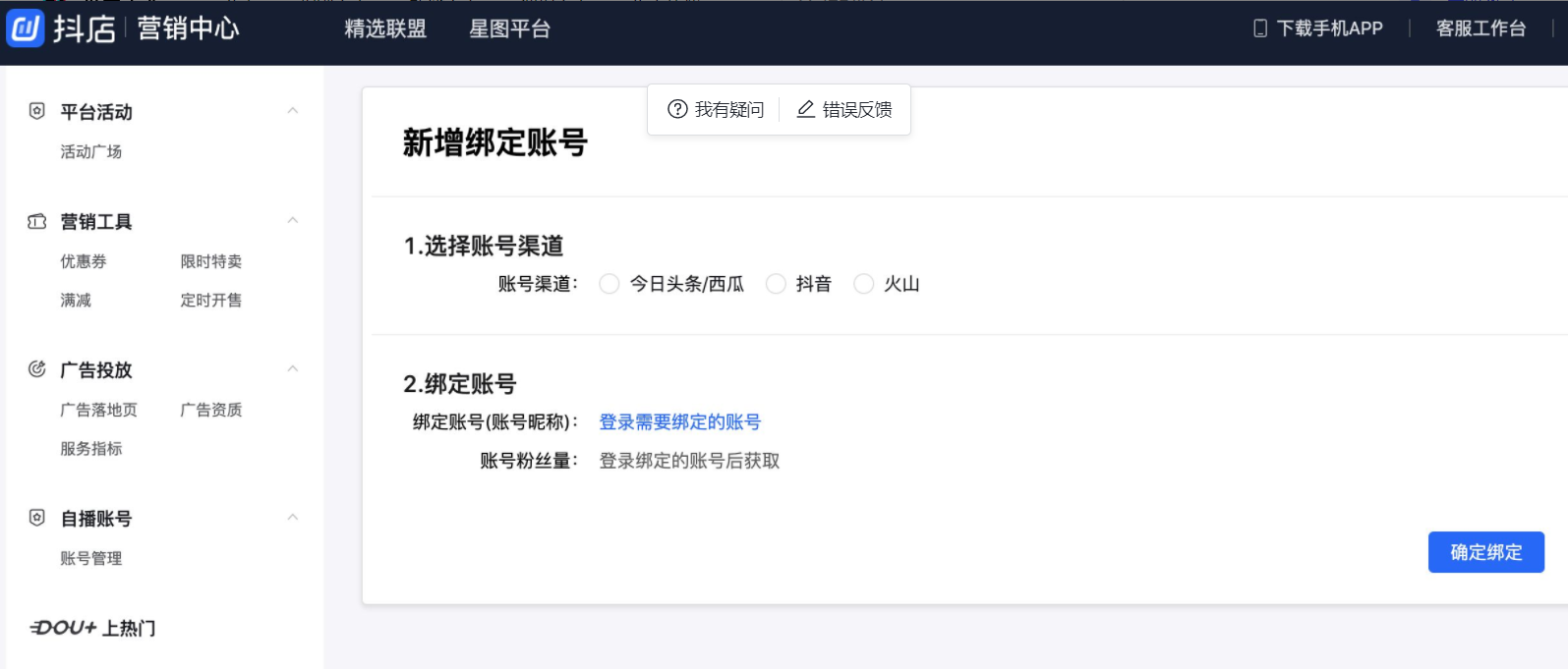 选择账号渠道,支持选择“今日头条/西瓜”、“抖音”、“火山”