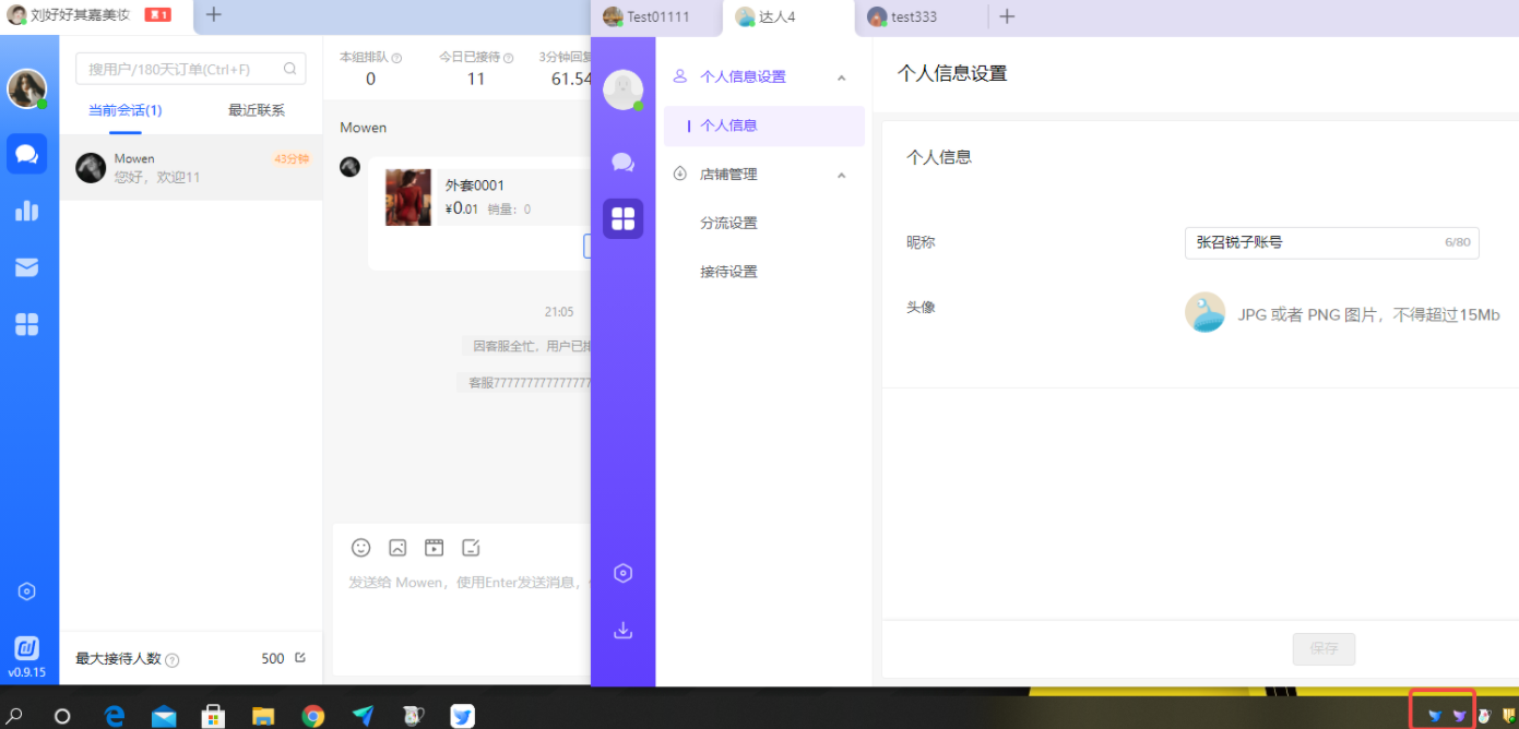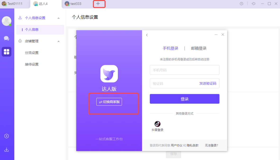 如有需要,客服可同时登录飞鸽商家版和飞鸽达人版。您可点击右上角的“+”号,选择切换商家版登录。登录成功后,页面将分别展示飞鸽商家版和飞鸽达人版,您也可以在电脑底部任务栏中进行区分(蓝色图标为飞鸽商家版,紫色图标为飞鸽达人版)。