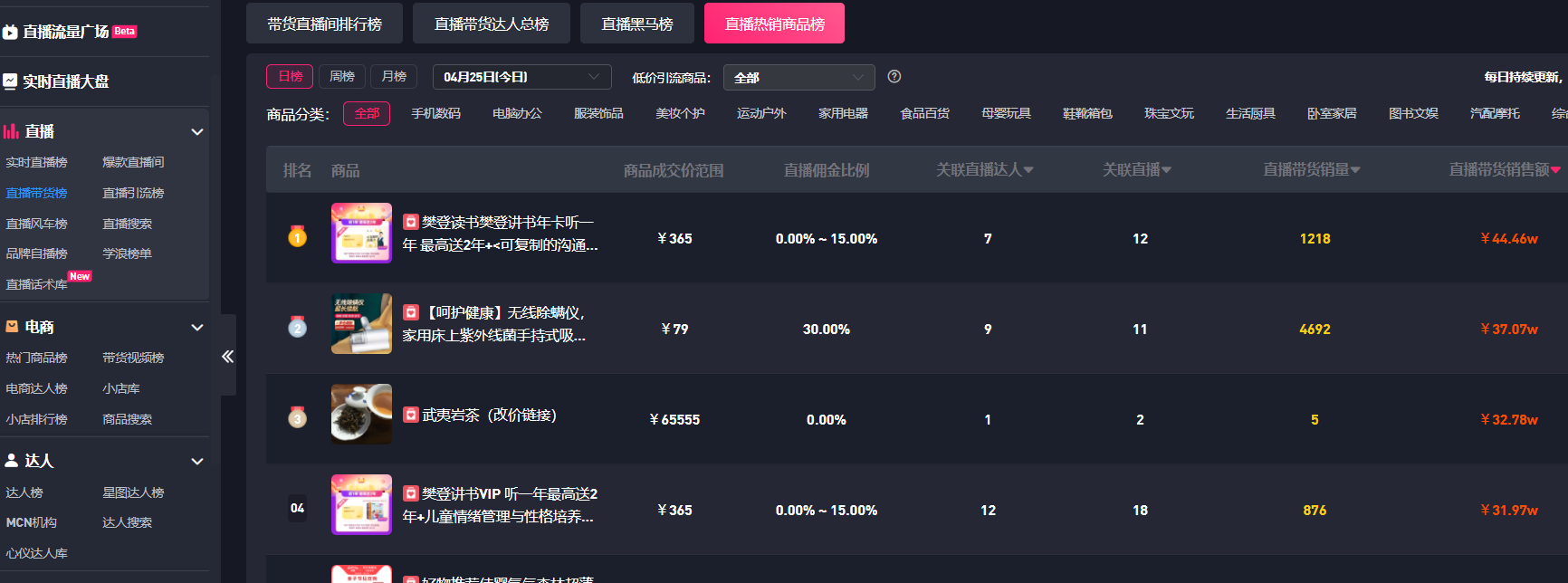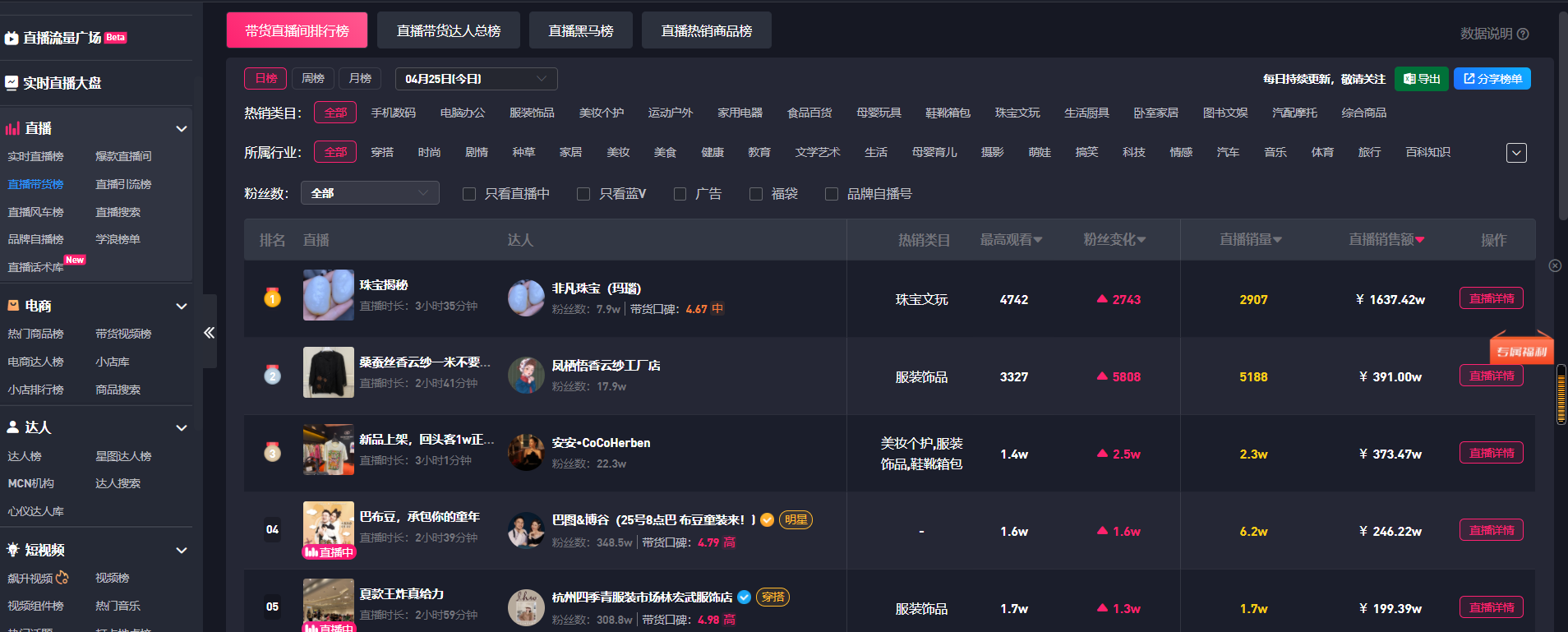 【直播带货达人榜】设有36个行业分类及15个商品类目可供您选择。