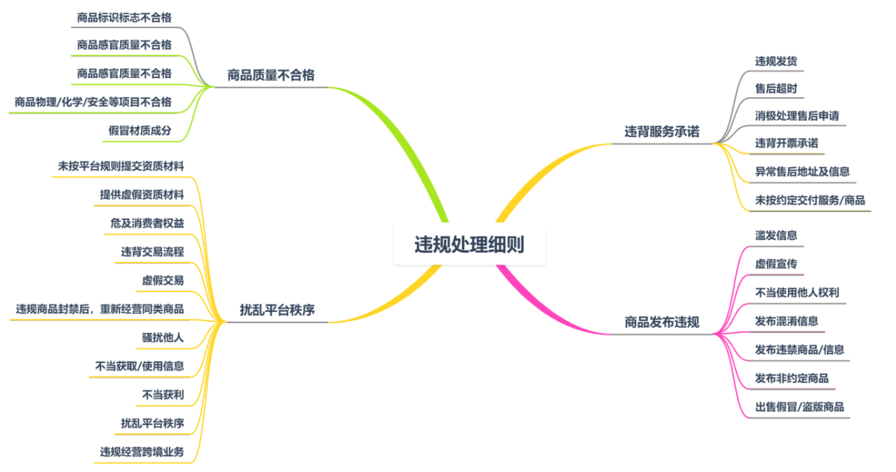 违规处理细则主要可以分为4大类:商品质量、扰乱平台秩序、违背服务承诺和商品发布违规