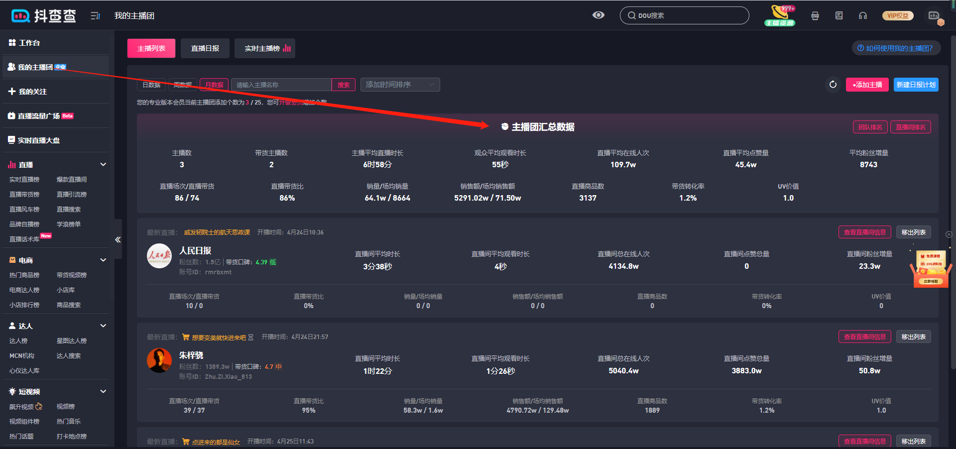 可以在主页我的主播团查看所有关注的主播团的数据,包括直播场次、平均时长、平均在线人数等维度。