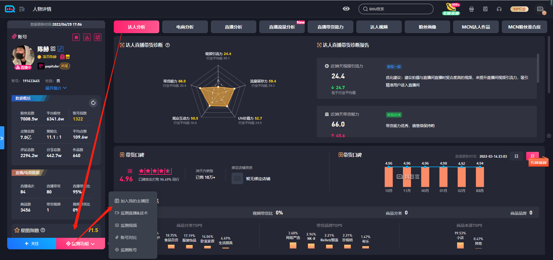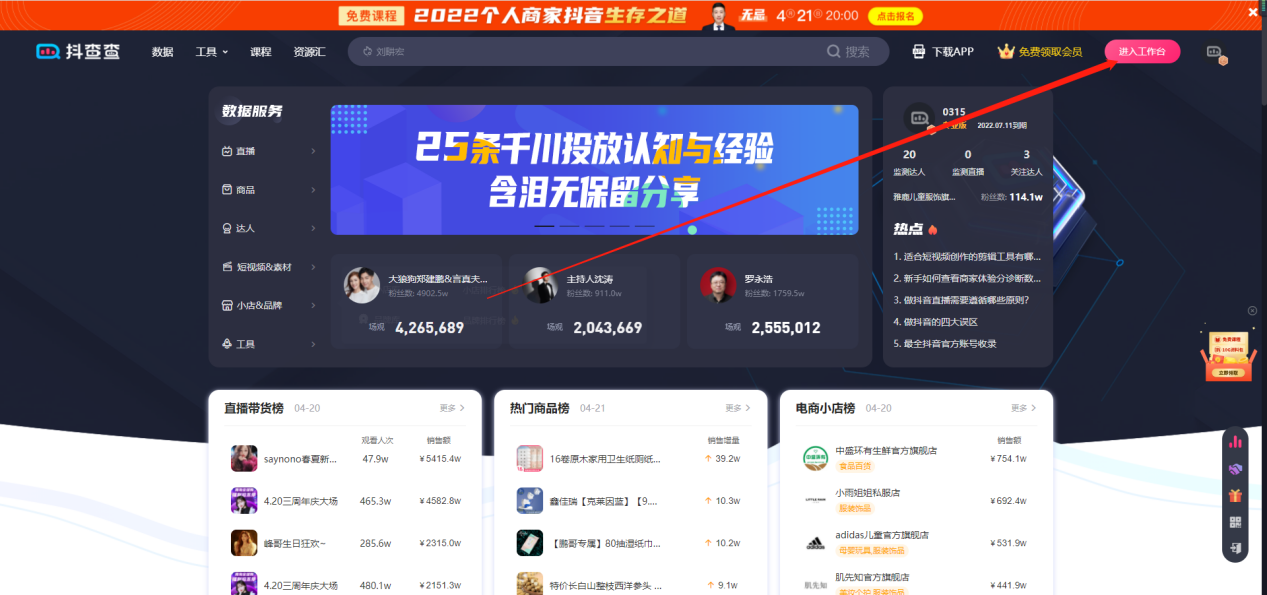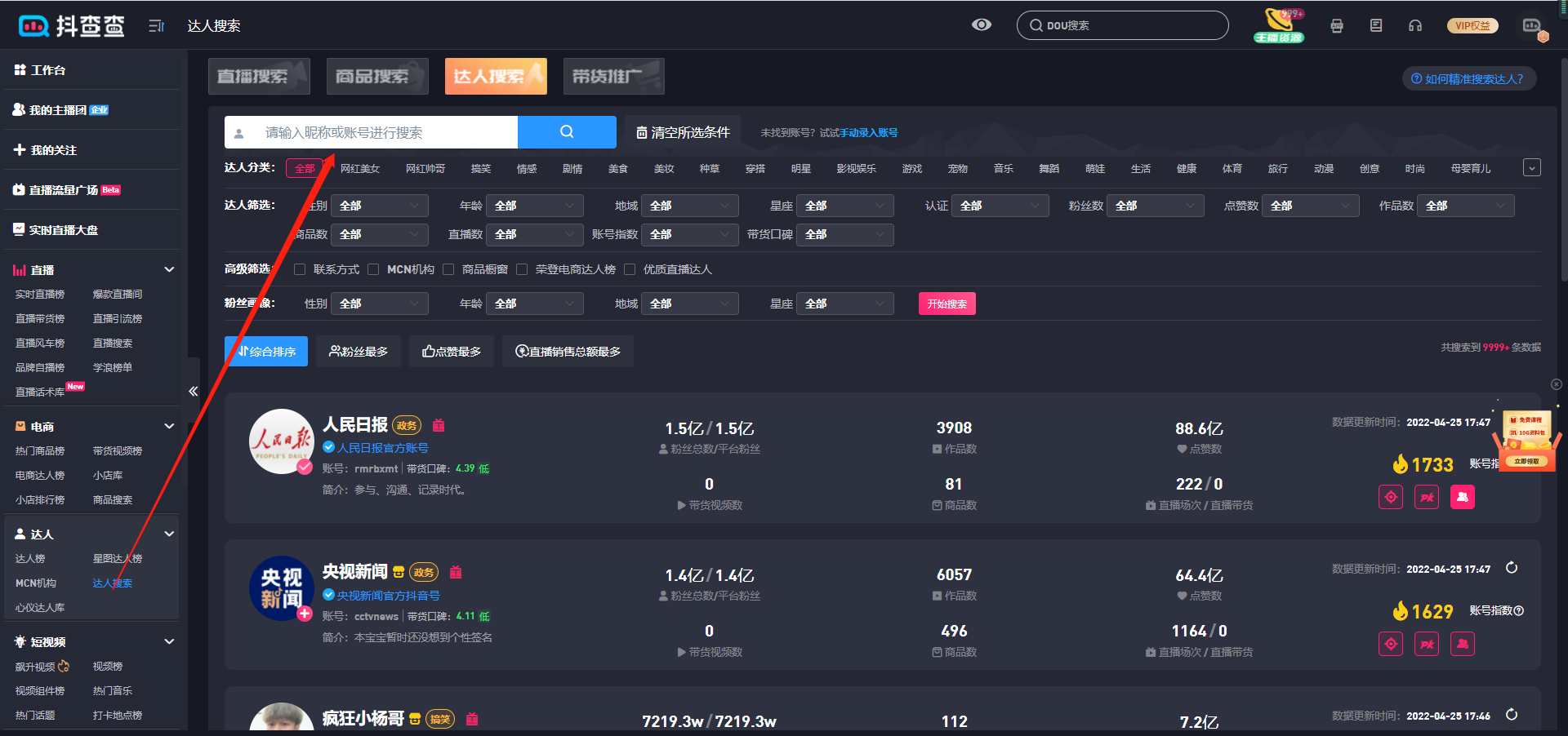 1、点击抖查查进入工作台https://www.douchacha.com,搜索达人,进入详情页