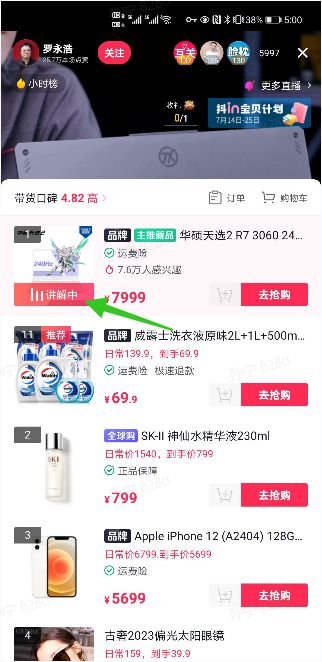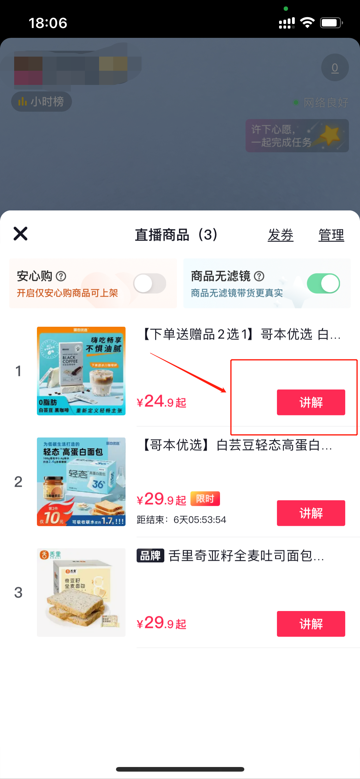 1、开播中,点击【小黄车】,可以看到“讲解”按钮,点击“讲解”按钮,消费者端可以看到讲解卡,了解当前在介绍哪个商品: