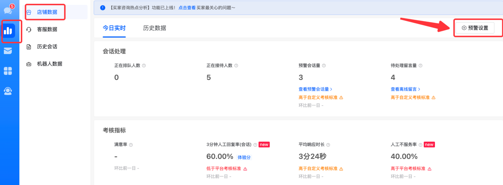 • 平台考核值预警支持按店铺维度、客服维度设置预警: