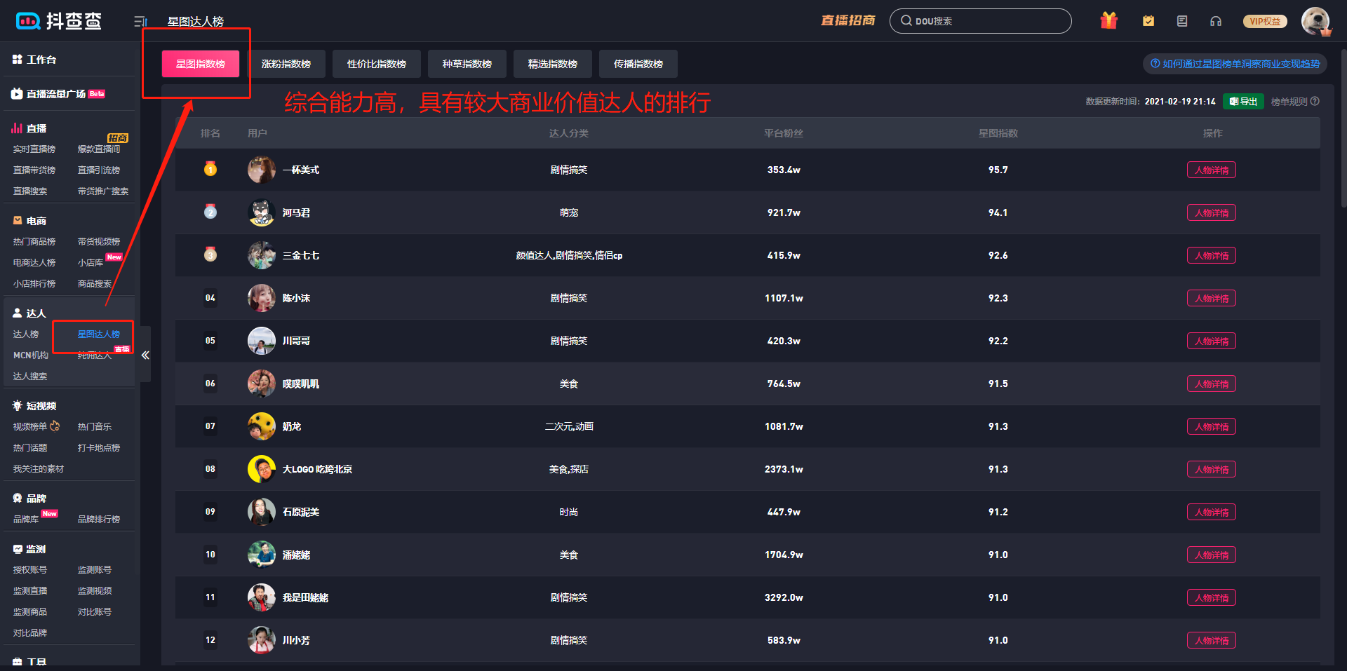 筛选规则:百万粉丝量级,星图指数较高且各项数据综合能力高的优质达人。