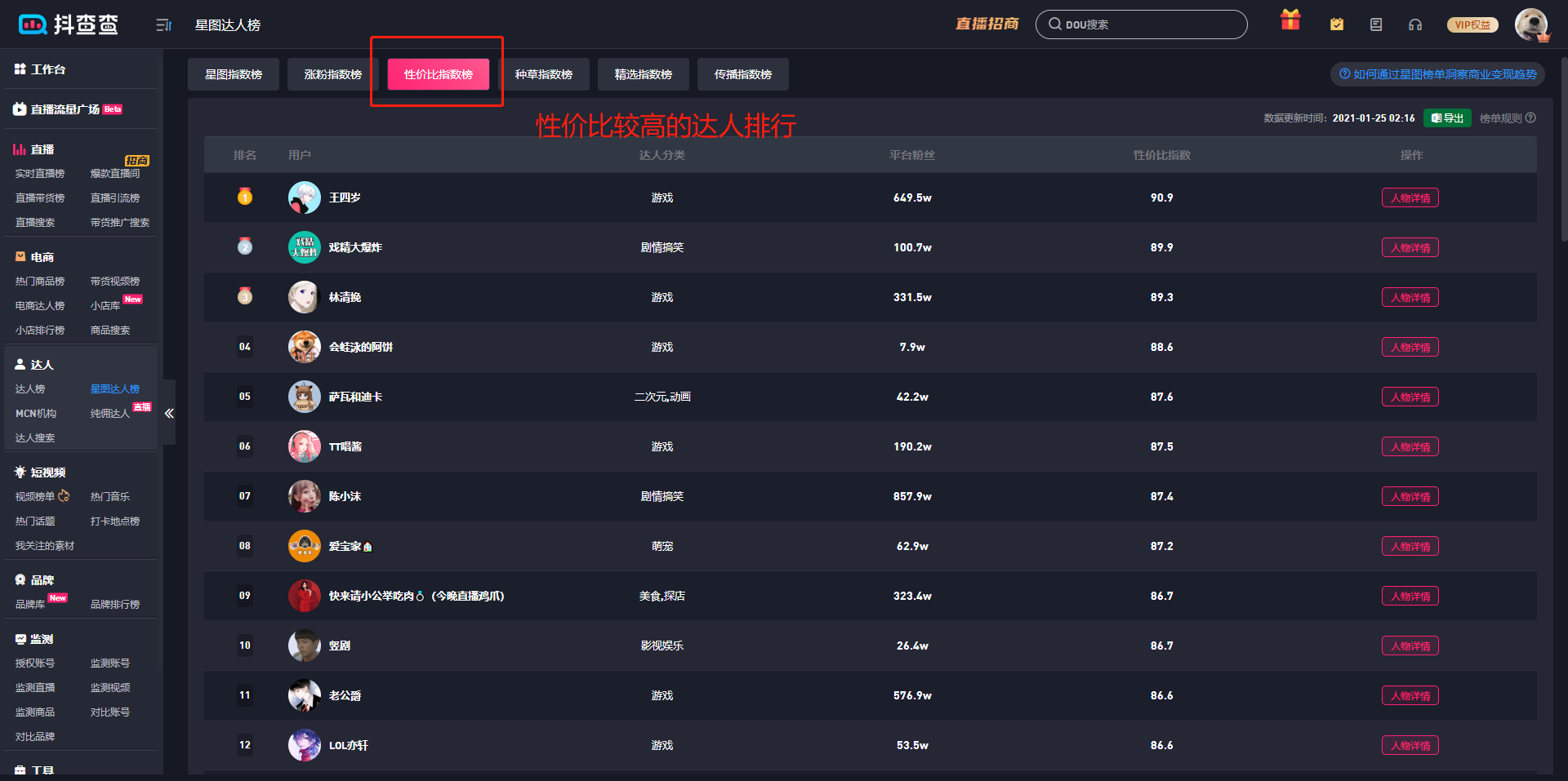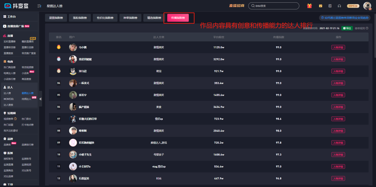 【星图达人榜】是推广接单的平台,星图推出的专业榜单。在榜单中可以按综合能力、性价比、传播能力等查找处于不同阶段具有较高商业价值的达人。