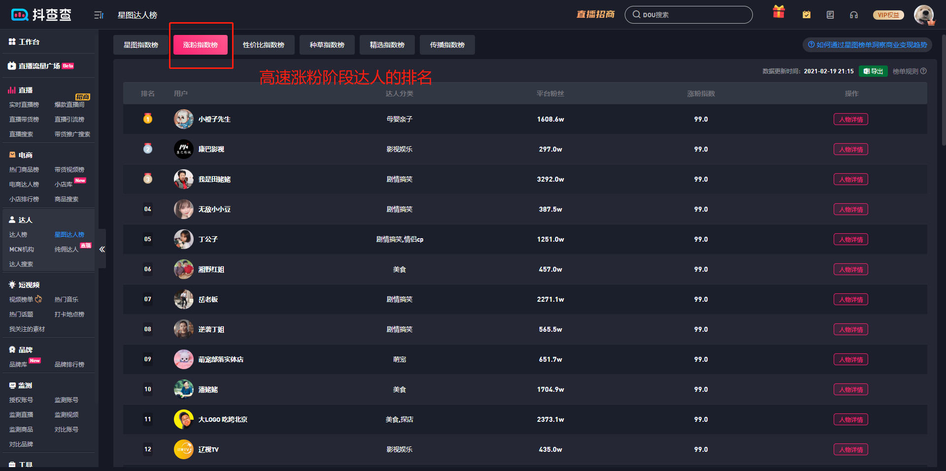筛选规则:评估创作者近15日有效涨粉数据进行排序。