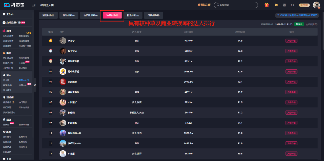 筛选规则:综合评估创作者内容组件点击、成交、内容播放、互动等数据,评估达人种草能力进行排序。