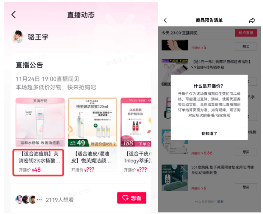回答:主播可以自己设置是否提前预告开播价;若主播未设置,开播价会显示为“???”。请您按照直播间到手价真实设置开播价格,切勿夸大/虚假描述,否则将按照平台违规规则进行统一判罚。