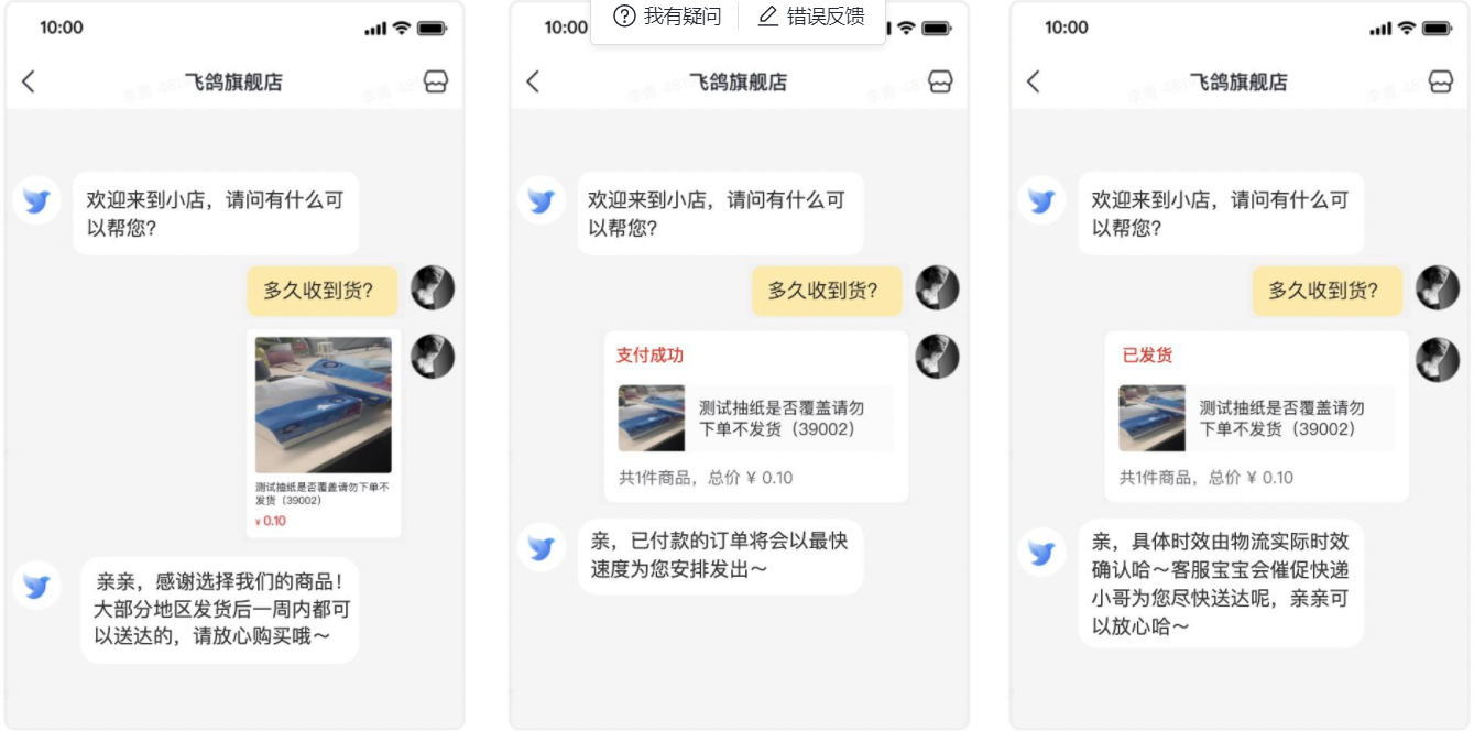 • 用户:选择并发送想要咨询的订单,机器人可以根据用户意图和订单状态精细化地回复顾客的问题。
