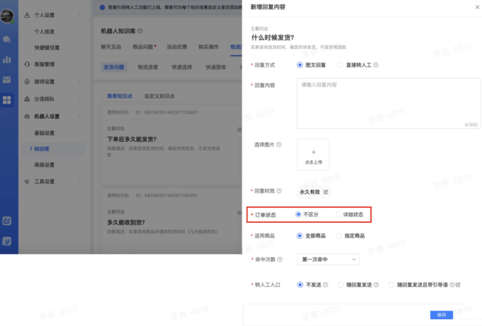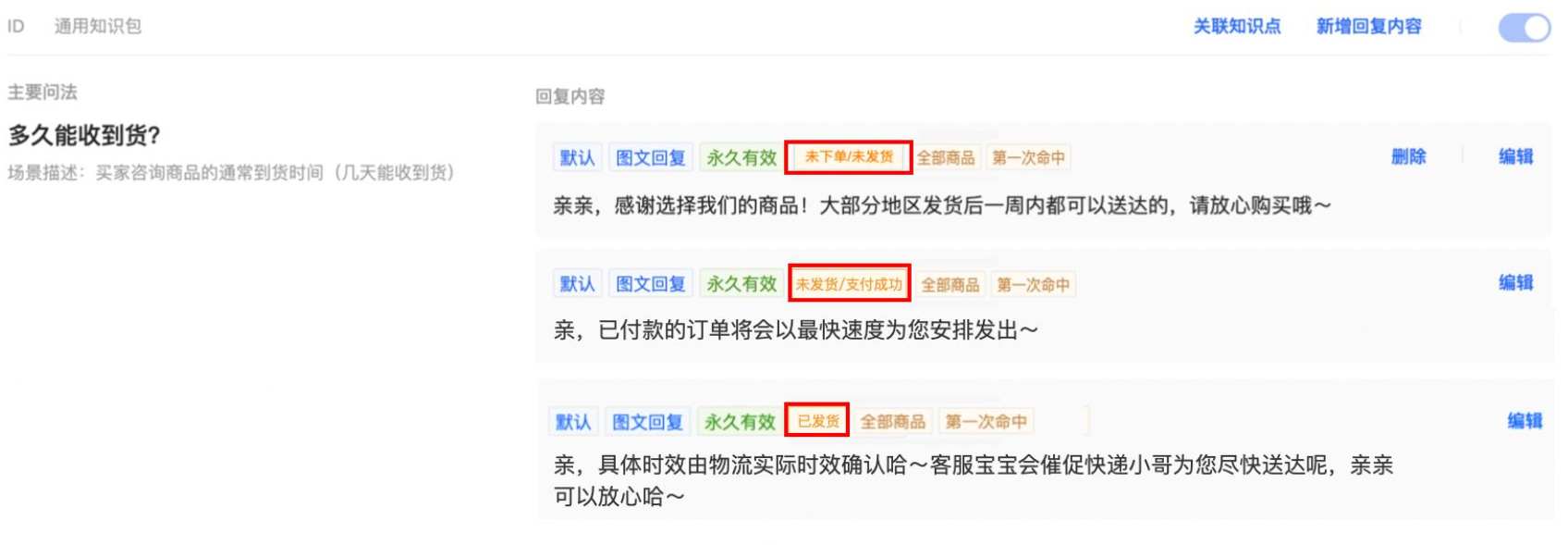 • 商家:可以在知识点回复中增加「订单状态」,根据不同的订单状态优化知识点的回复内容;