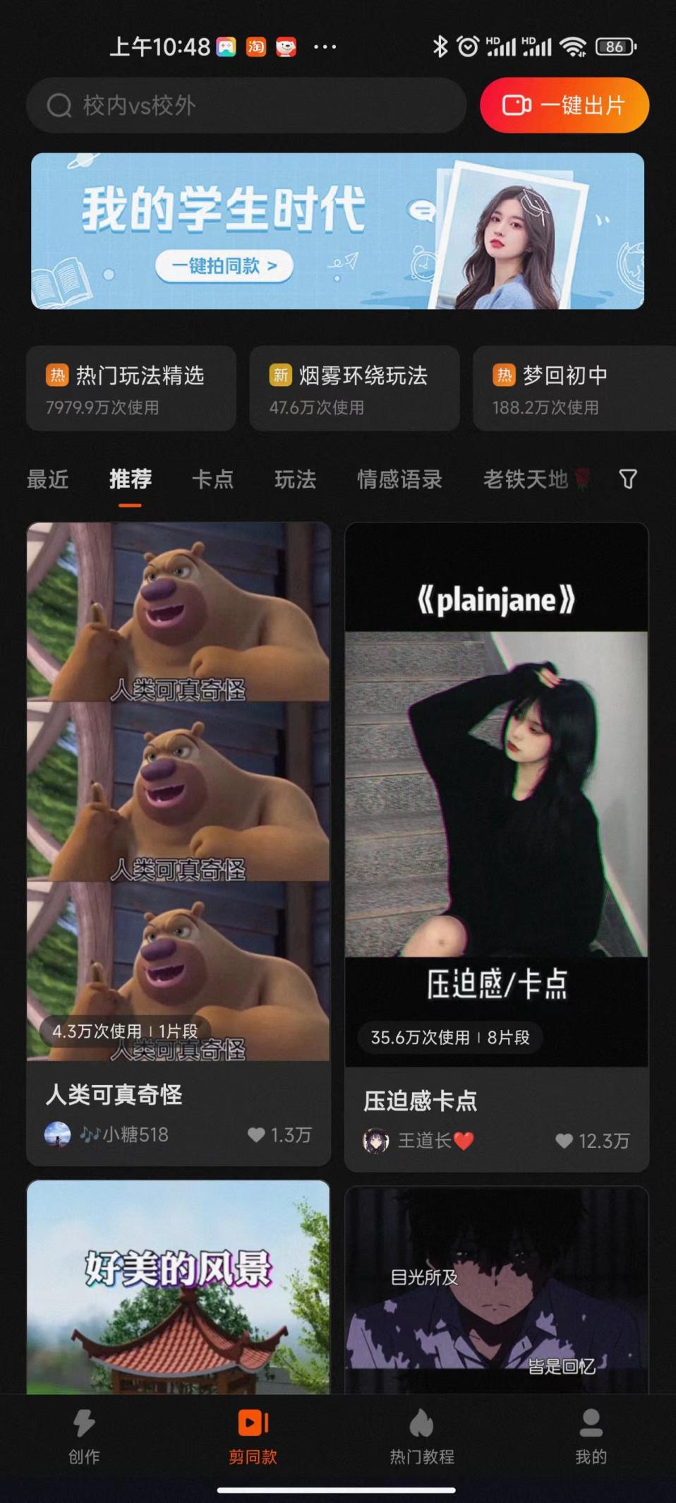 它的功能、使用方式和剪映相差无几,都有视频剪辑、编辑的主要功能,提供大量剪辑模板,帮助用户快速实现创作目的,也会提供新手入门、剪辑技巧、剪辑构思等学习教程以及专业的视频拍摄功能。