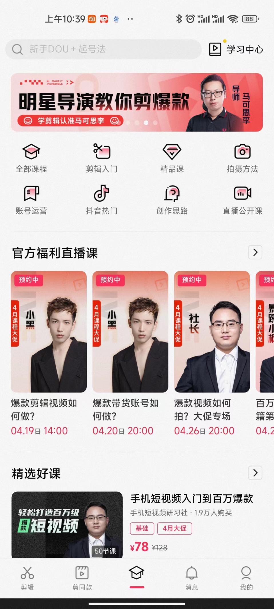 如果你想要制作高级的短视频,剪映还提供了“创作课堂”栏目,会有官方推荐的剪辑课程供大家学习,对新人上手非常友好。