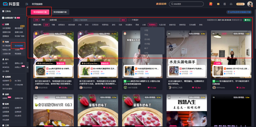 抖查查针对用户痛点推出了【带货视频榜】功能。我们的【带货视频榜】与【带货视频飙升榜】将商品划分为不同的分类,又在分类下方分出了商品的二级分类,可以快速精准的帮助您找到符合您标准的数据。