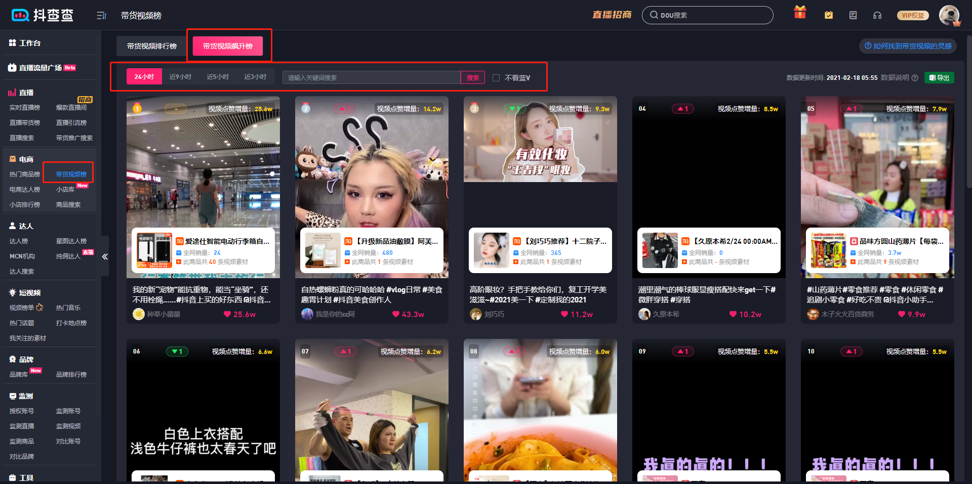 为您提供小时级别的带货视频数据,让您更快了解什么类型的带货视频获赞量高;什么类型的商品销量高。