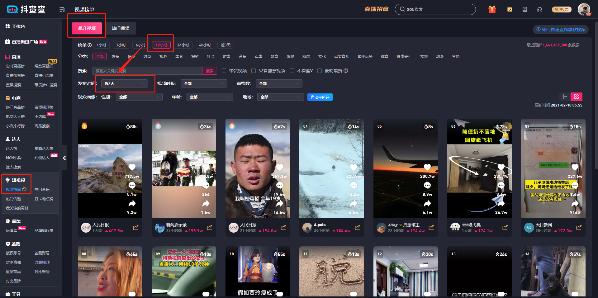 例:如下图,榜单选择12小时,发布时间选择近3天,即表示12小时内,发布时间在近3天的视频获赞增量从大到小榜单展示