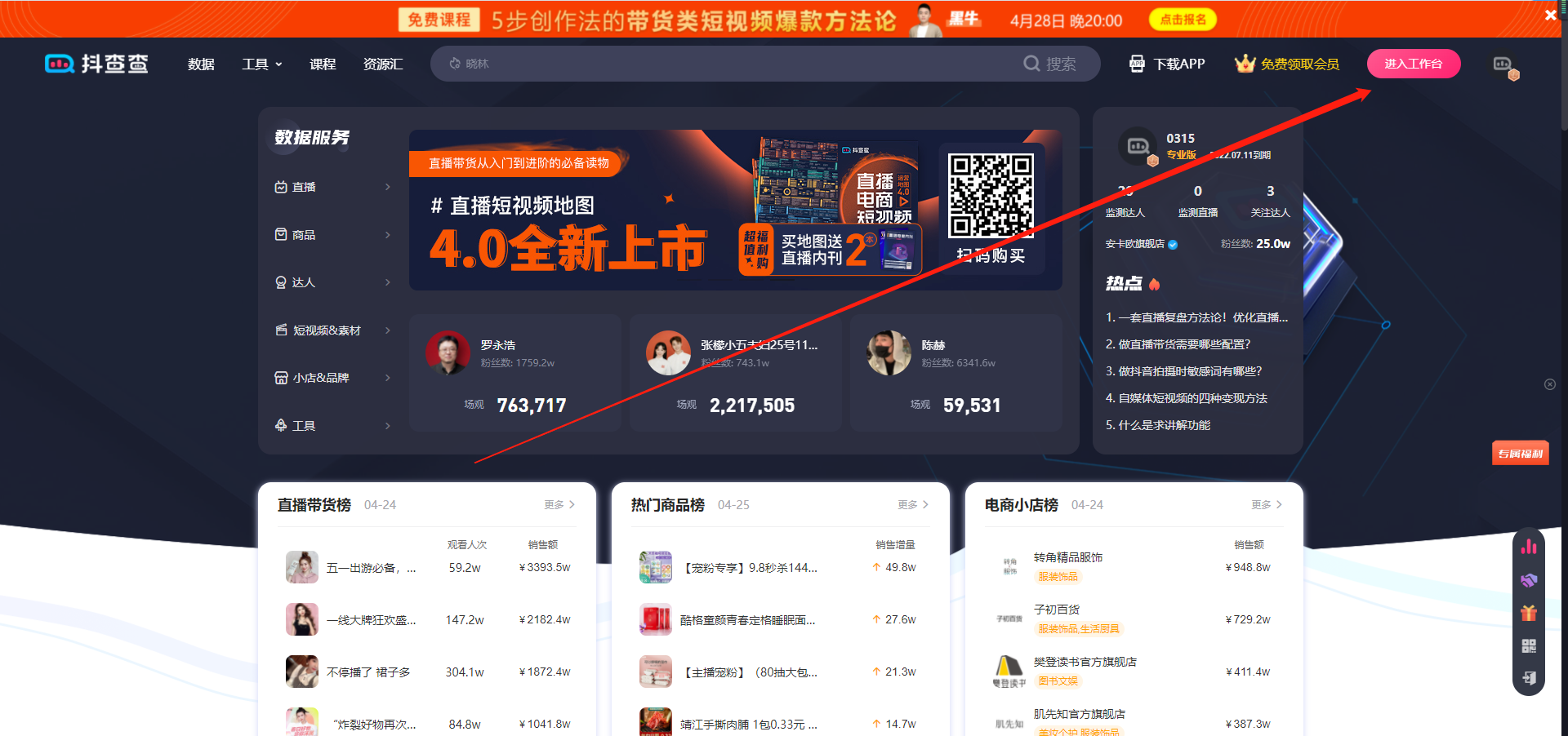 首先打开抖查查主页。选择上方【进入工作台】搜索框点击搜索达人