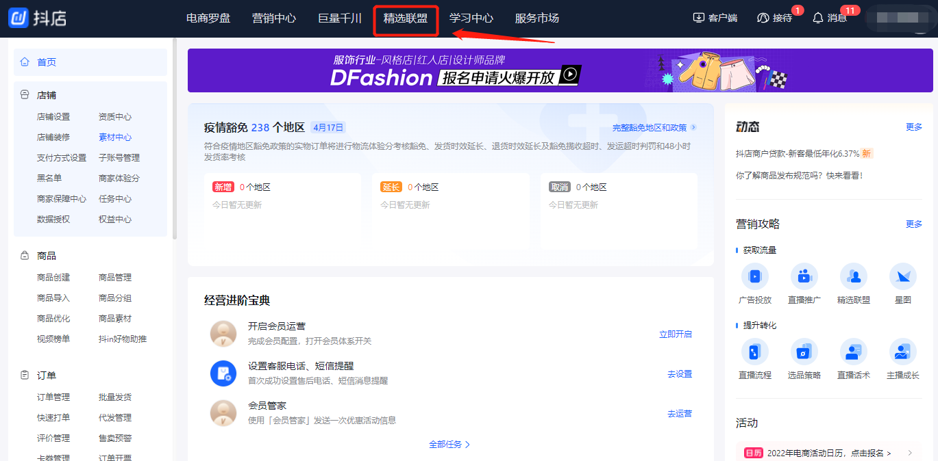 第一步:进入配置入口:【抖店后台】-【精选联盟】