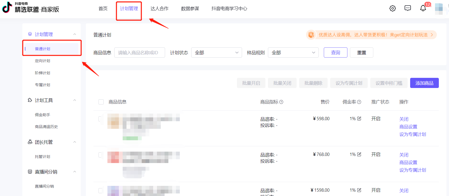 佣金规则:普通计划的佣金必须>=1%。