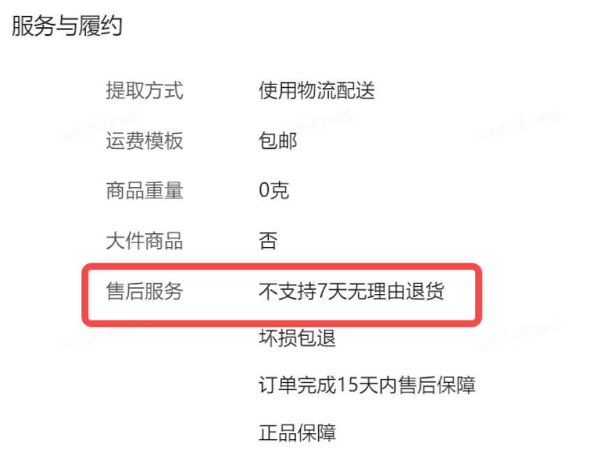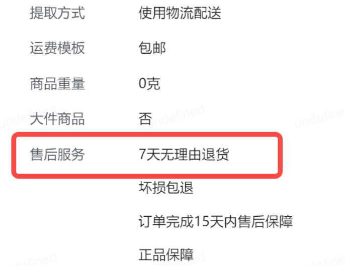 七天无理由退货不符规范性要求:商品描述里售后服务需要和主图保持一致。若商家售后服务为支持7天无理由退换货,主图也为支持7天无理由退换货,若商家售后服务为不支持7天无理由退换货,主图也为不支持7天无理由退换货。