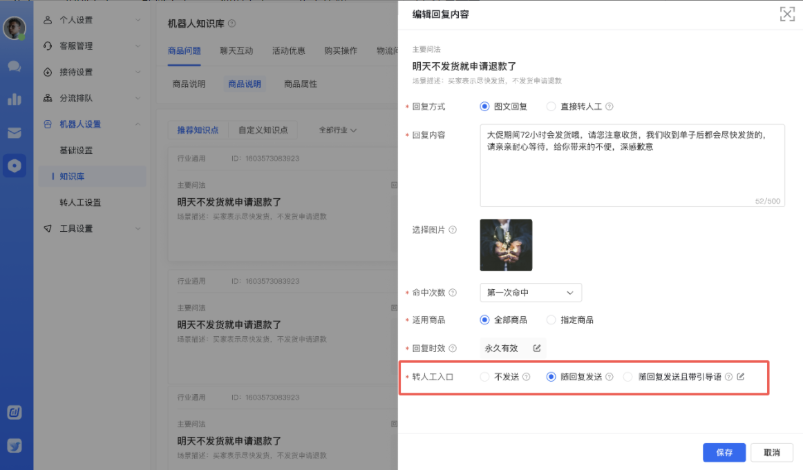 • 场景说明:商家在知识库中配置,当消费者提问命中某个特定知识点时,可在机器人回复下配置是否添加转人工入口,以及转人工引导语。