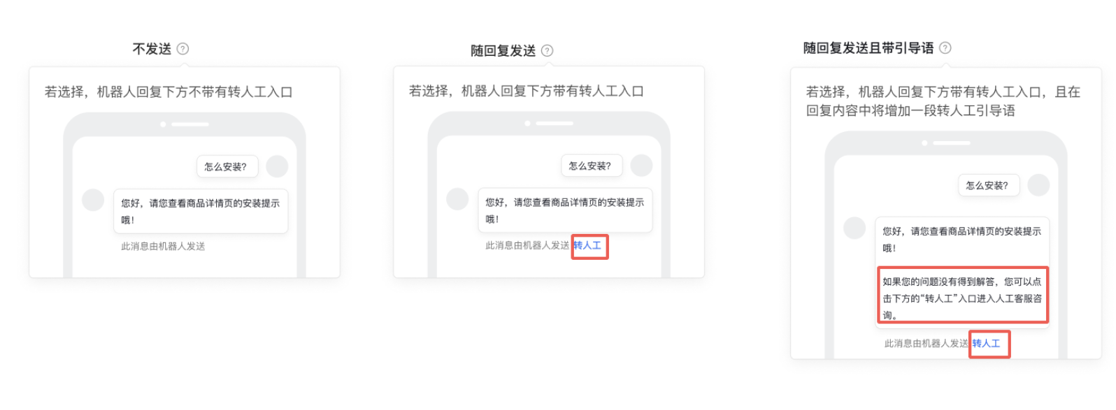• 路径:推荐/自定义知识点-》新建/编辑回复-》转人工入口-》勾选“随回复发送”或“随回复发送且带引导语”。