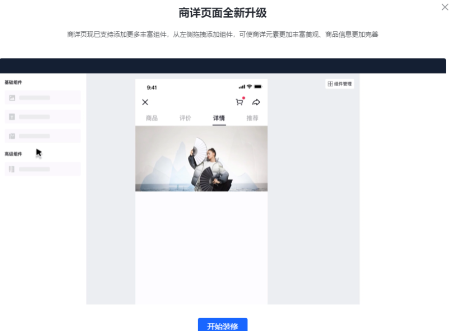 商品详情装修是平台为商家提供的可自主设计商品详情页的能力,通过使用商品详情装修系统自带模板组件功能,商家可在商品详情页中增加更为丰富的文字内容,使整体商详页面元素更加丰富&美观、商品信息更加完善,从而提升商品购买转化效果。