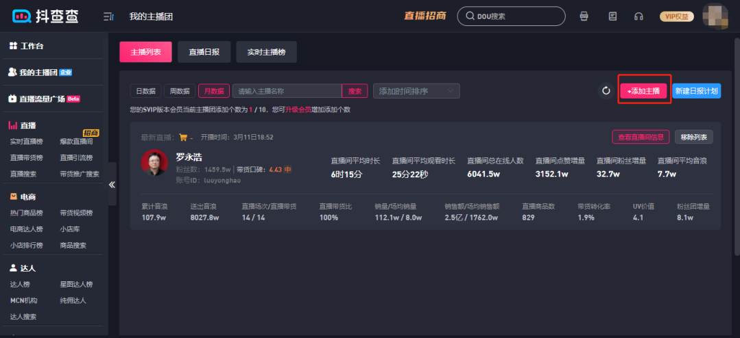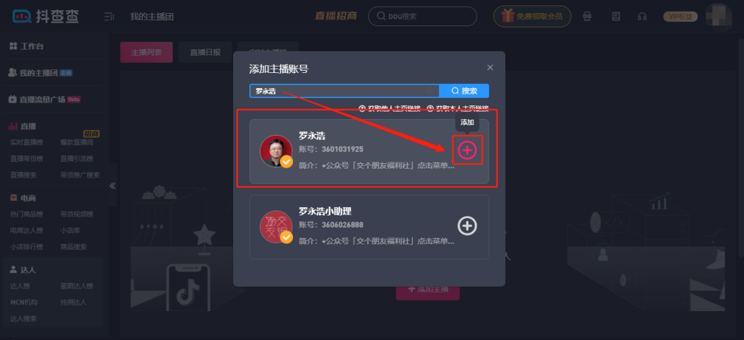 第一步:需要您将想要管理的直播达人(我们在此功能内将直播达人称为“主播”)添加到您的主播团