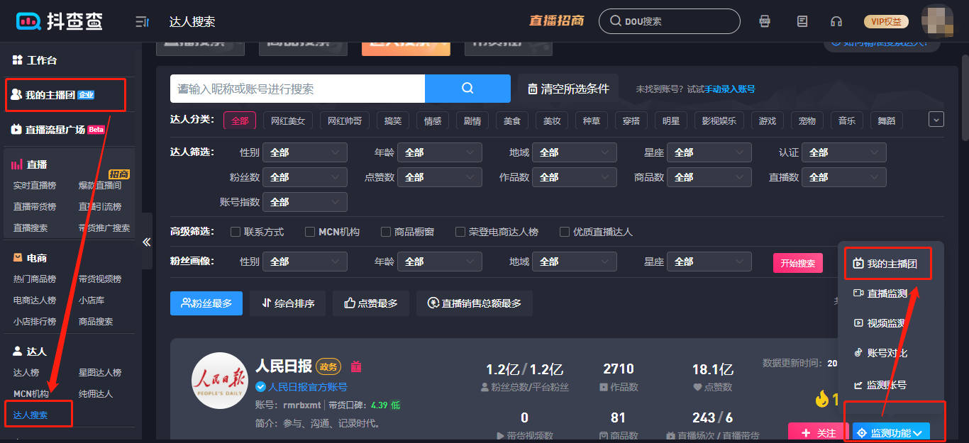 【添加主播入口4】在达人搜索页面鼠标移入“监测功能”点击“我的主播团”,跳转到“我的主播团”页面进行添加即可。