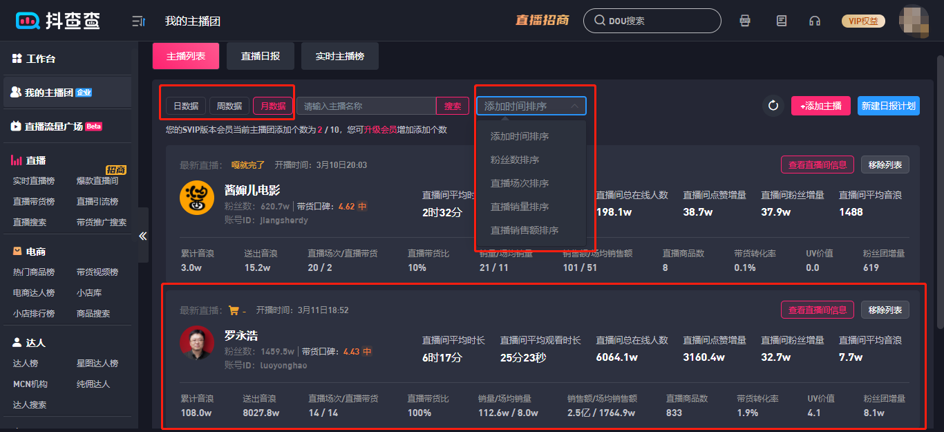 【排序】可以通过多种排序让您更快掌握团队中的主播梯队
