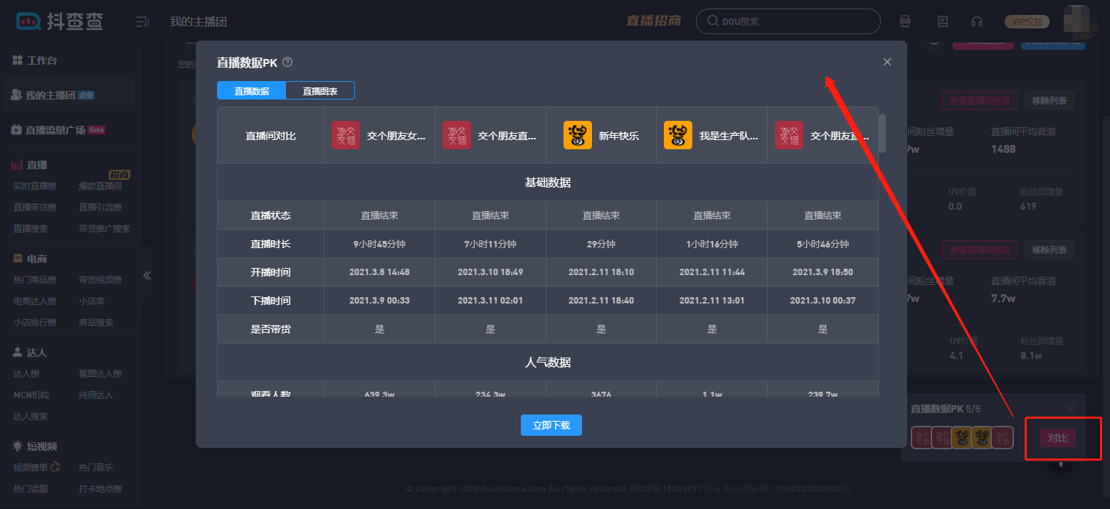 选择完直播间后,点击“直播数据PK弹窗”上的“对比”按钮,展示直播数据PK的展示弹窗,可选择正在直播的直播间进行对比。