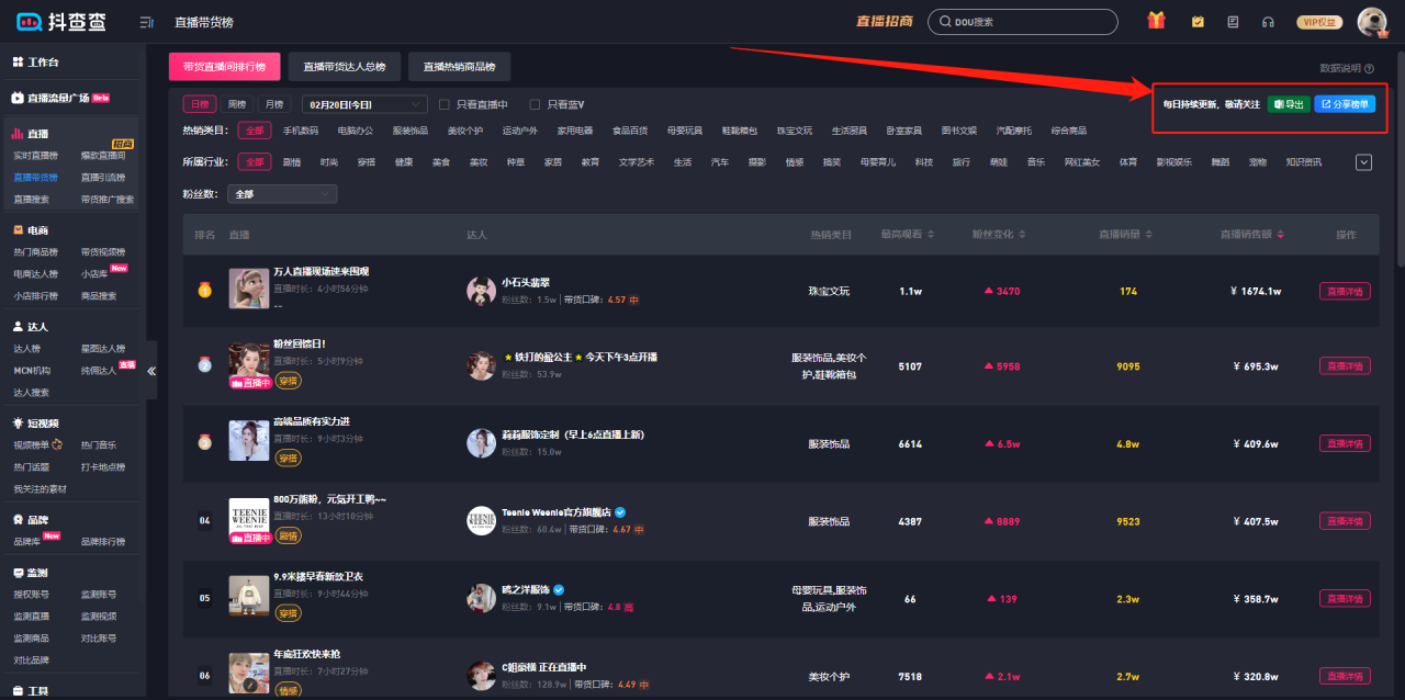 在抖查查的部分榜单中支持数据导出,数据导出选项位于榜单的