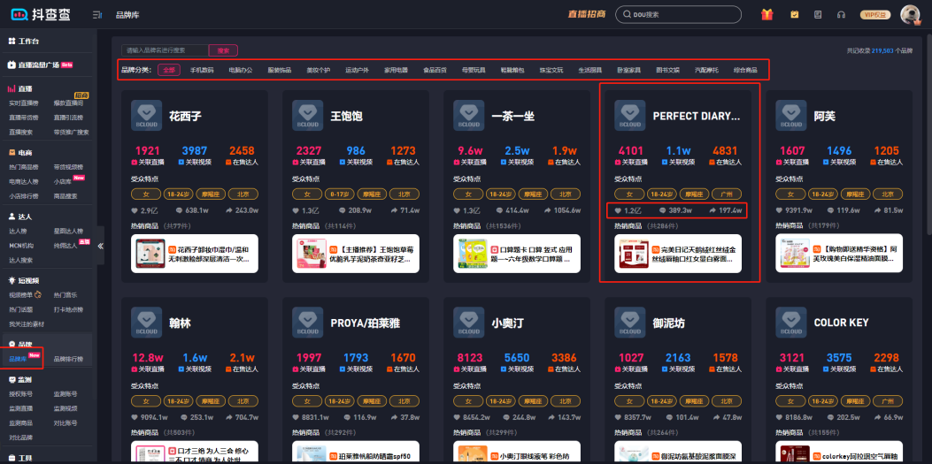 通过查看品牌的分类可以更快速的找到在各领域近期热销的分类。关联直播数、关联视频数、在售达人数、品牌的点赞数、评论数与分享数可以帮助我们判断近期品牌及其商品的热度变化。