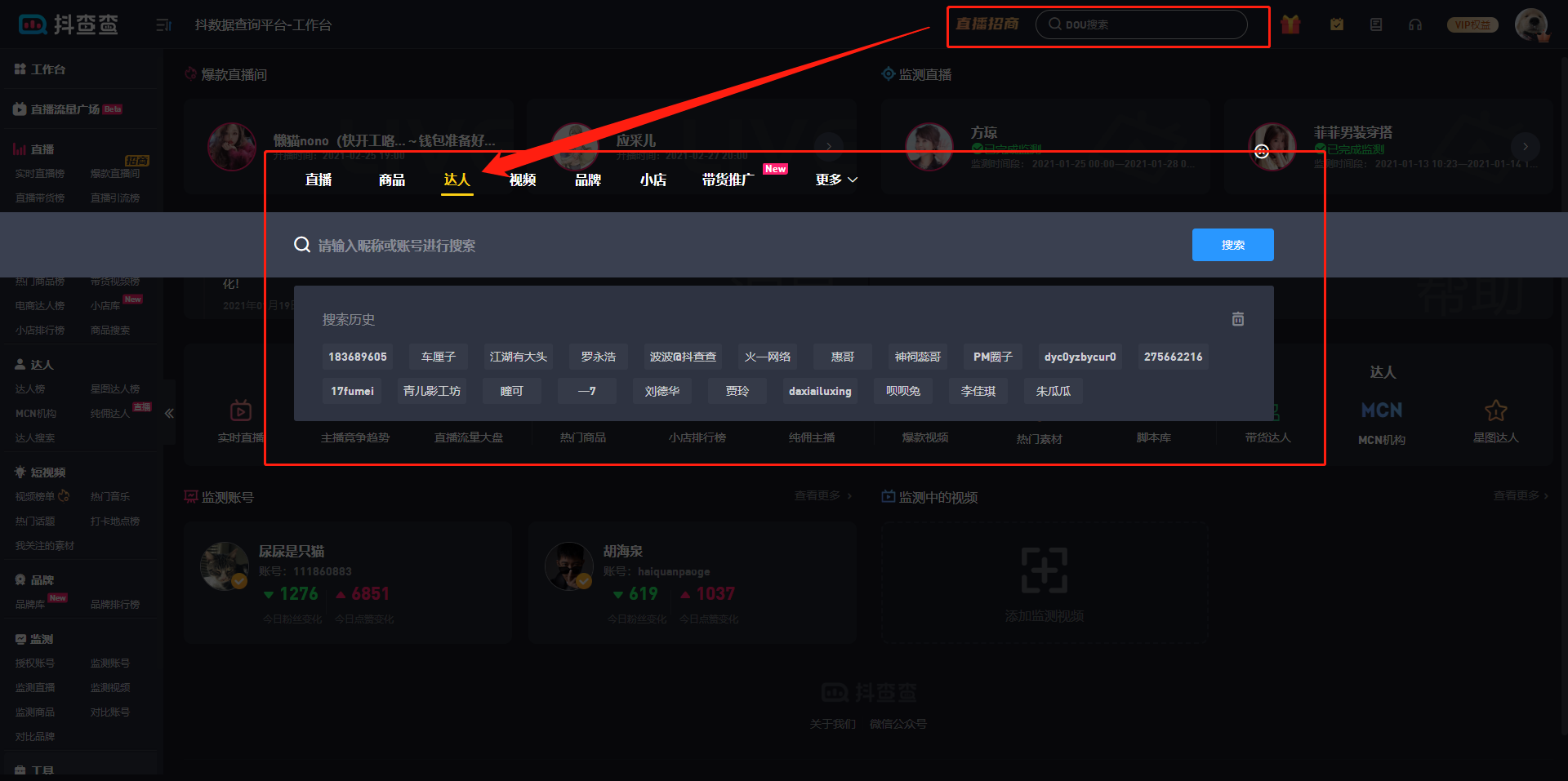 首先打开抖查查主页。选择上方【DOU搜索】搜索框,出现搜索弹窗后,输入该达人的账号或昵称,点击【搜索】即可。