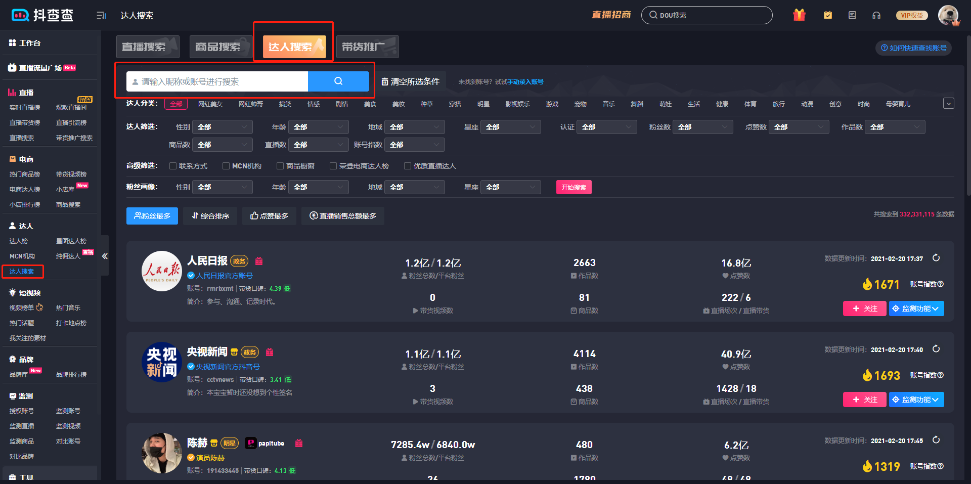 点击左侧导航栏内的【达人搜索】选项进入达人搜索页面,在此页面您可以对搜索结果进行更详细的筛选。在搜索框内输入对应达人的账号或昵称,点击【搜索】即可。