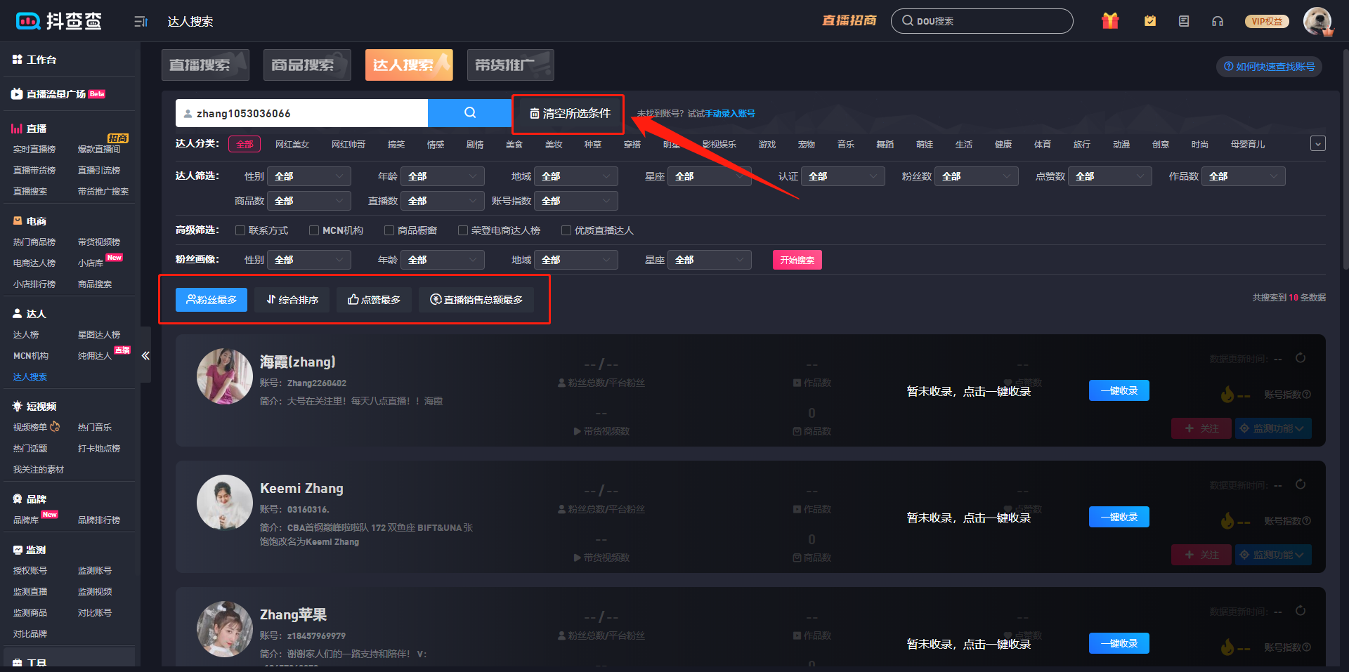 如搜索结果未出现想要查找的达人,建议切换下方的排序方式来进行查找。如依然搜索不到,可点击【清空所有筛选条件】后再进行搜索。
