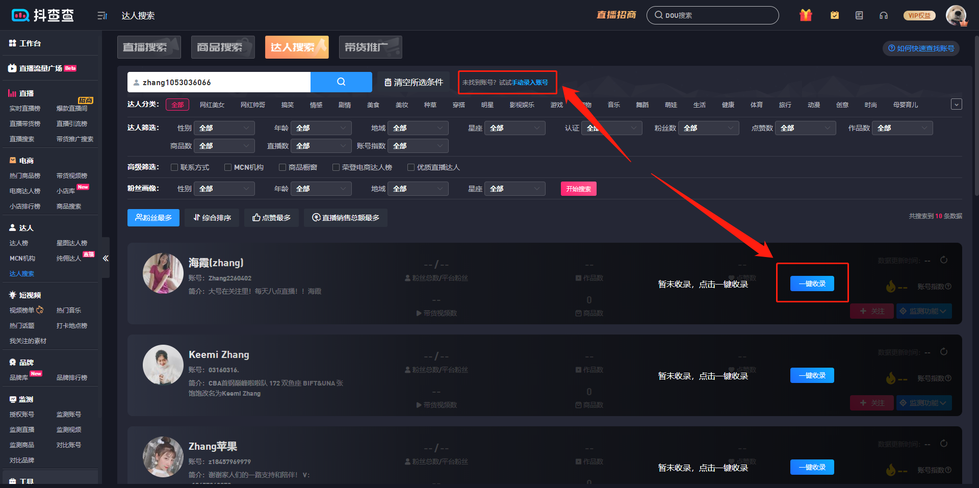 可点击搜索按钮右侧的【手动收录账号】选项进行收录,或点击下方【一键收录】收录。