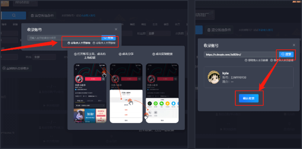 按照提示获取主页链接填入到搜索框内,点击【确认收录】后耐心等待约30分钟,再次搜索该达人即可。如还未出现,请联系客服人员解决。