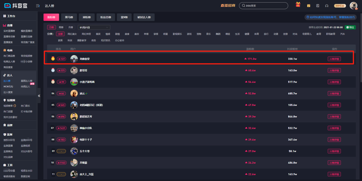 我们以1月21日【涨粉榜】第一名的“龙帅食堂”来举例,是什么让他一夜涨粉170万呢?接下来让我们根据数据来查找原因。
