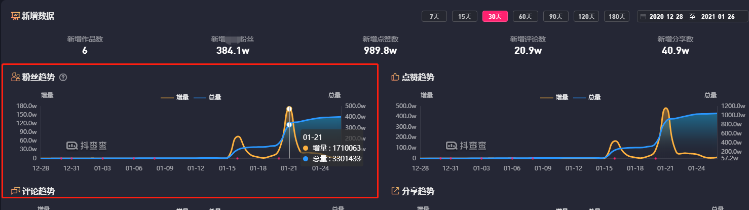 来到【达人详情页】内,通过【粉丝趋势图】我们可以看到:30天内该达人的粉丝增量在1月20日开始呈上涨趋势,并在21日达到最高值。那么是这两天发布了什么视频吗?