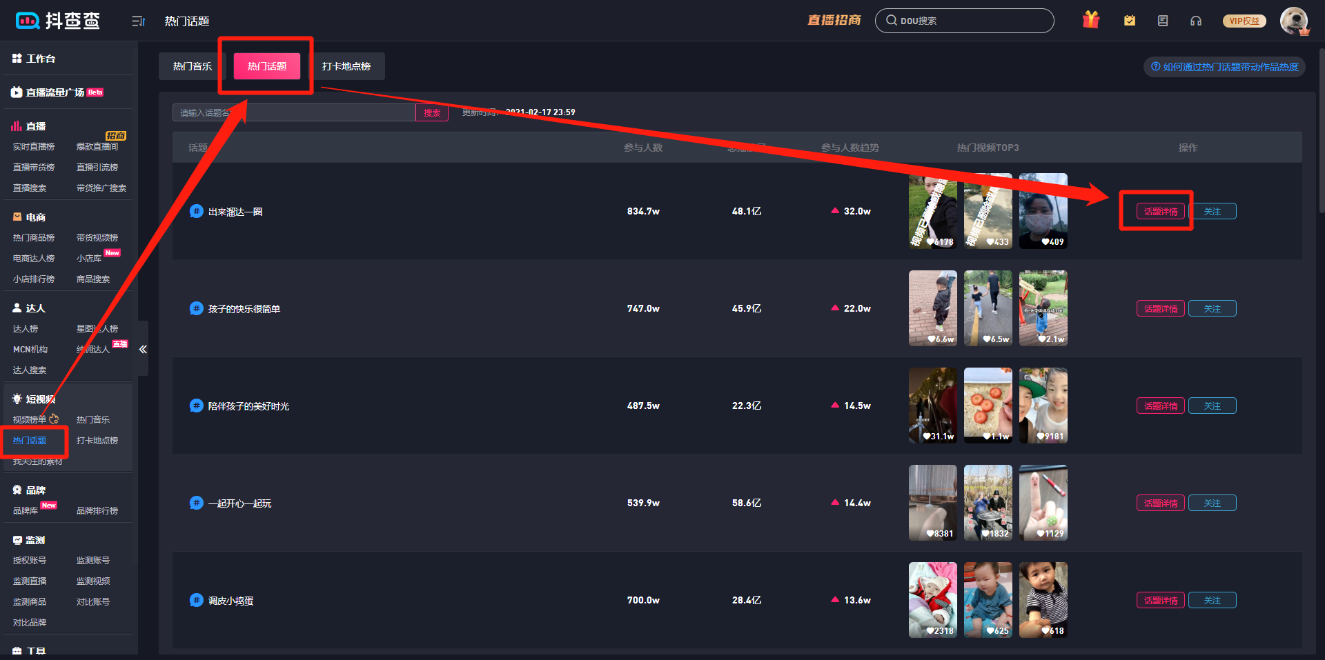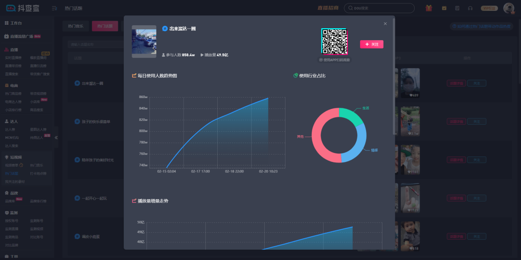 通过【热门话题】可以查看话题的参与人数、总播放量以及参与人数趋势,帮助用户快速发现热度较高的话题。